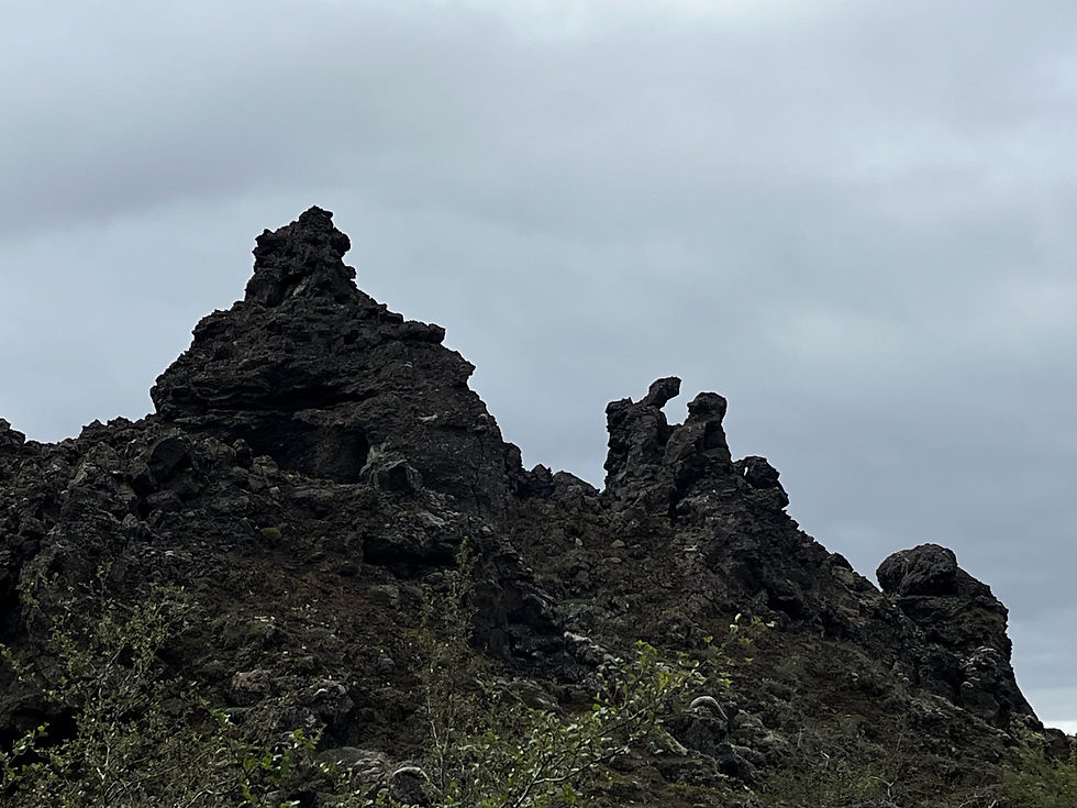 From the Nature Baths we went a relatively short distance to the Dimmuborgir Lava Fields. Our guide, Helga, walked us round. There were a number of trails of varying distance, we went about a kilometre. These fields are thousands of years old. The lava, when it erupted, didn’t always flow but remained where it was leaving incredible structures. Helga also told me more about the native trees. Basically they are two kinds of birch, one is Silver and the other is a darker variety. There is also juniper and she showed me some natural blueberries which she said are very tasty by the autumn but at the moment are still very green. She also picked up some lava rock and basalt for me. Many of the old houses were built of lava rock as it retains a slight warmth and due to its rough structure, grips its fellow bricks tightly.