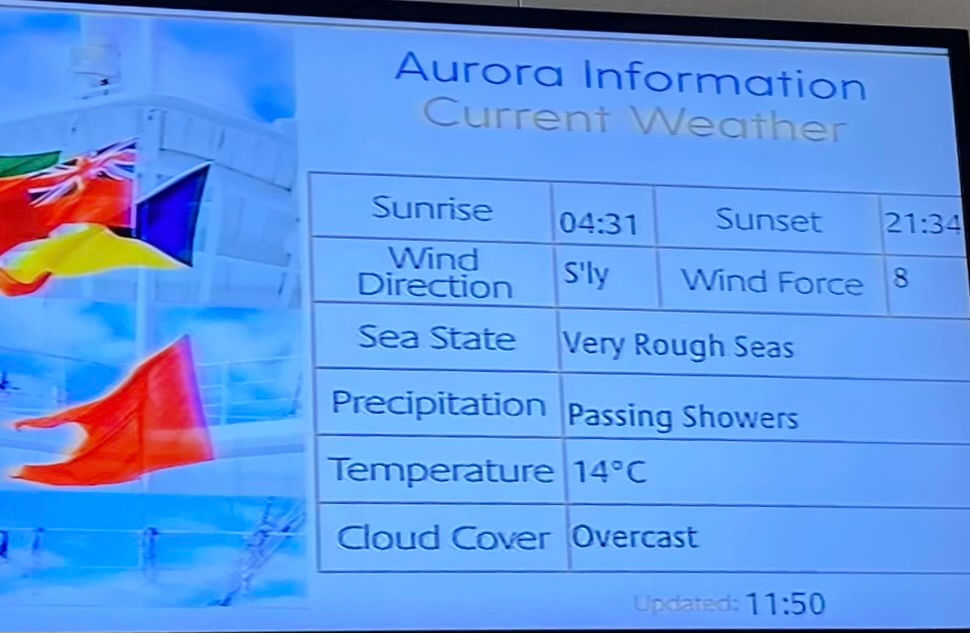 There really has been bad weather all day. Wind Force 8 according to the ship’s information board, with very rough seas.